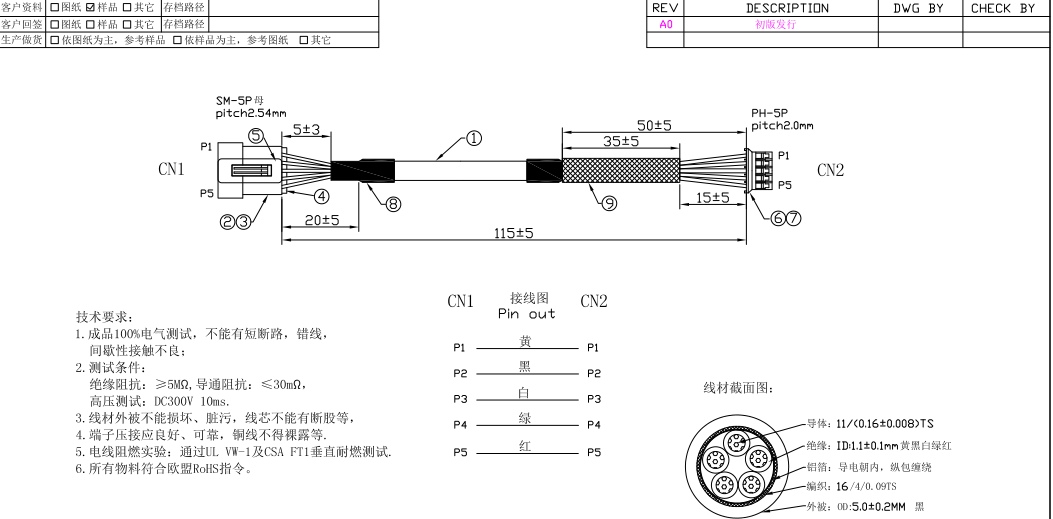 shenzhen factory PH TO SM terminal sheath wire black pcb internal wire harness custom cable
